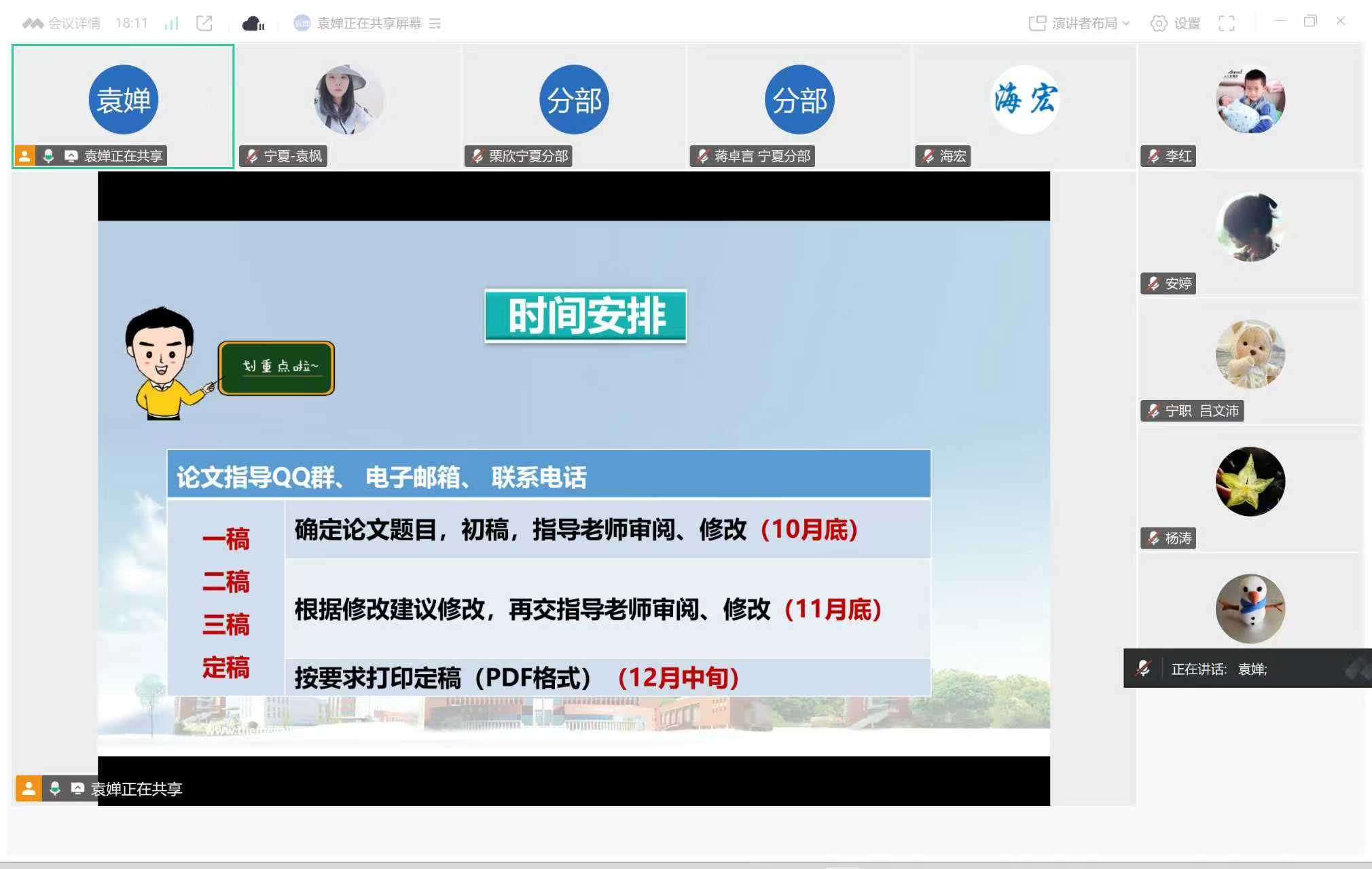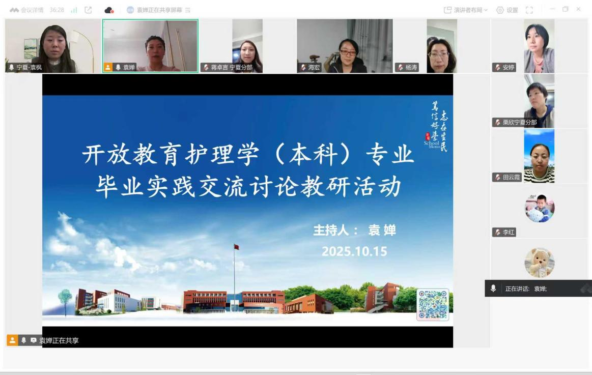 为进一步提升护理学本科毕业论文质量,规范指导流程,加强指导教师间的交流与协作,2025年10月15日晚,宁夏开放大学护理学本科专业通过腾讯会议线上平台,组织召开了本学期毕业论文指导专题教研活动。本次活动由护理学本科专业负责人袁婵老师主持,全体10位论文指导教师齐聚云端,共研共商论文指导工作。